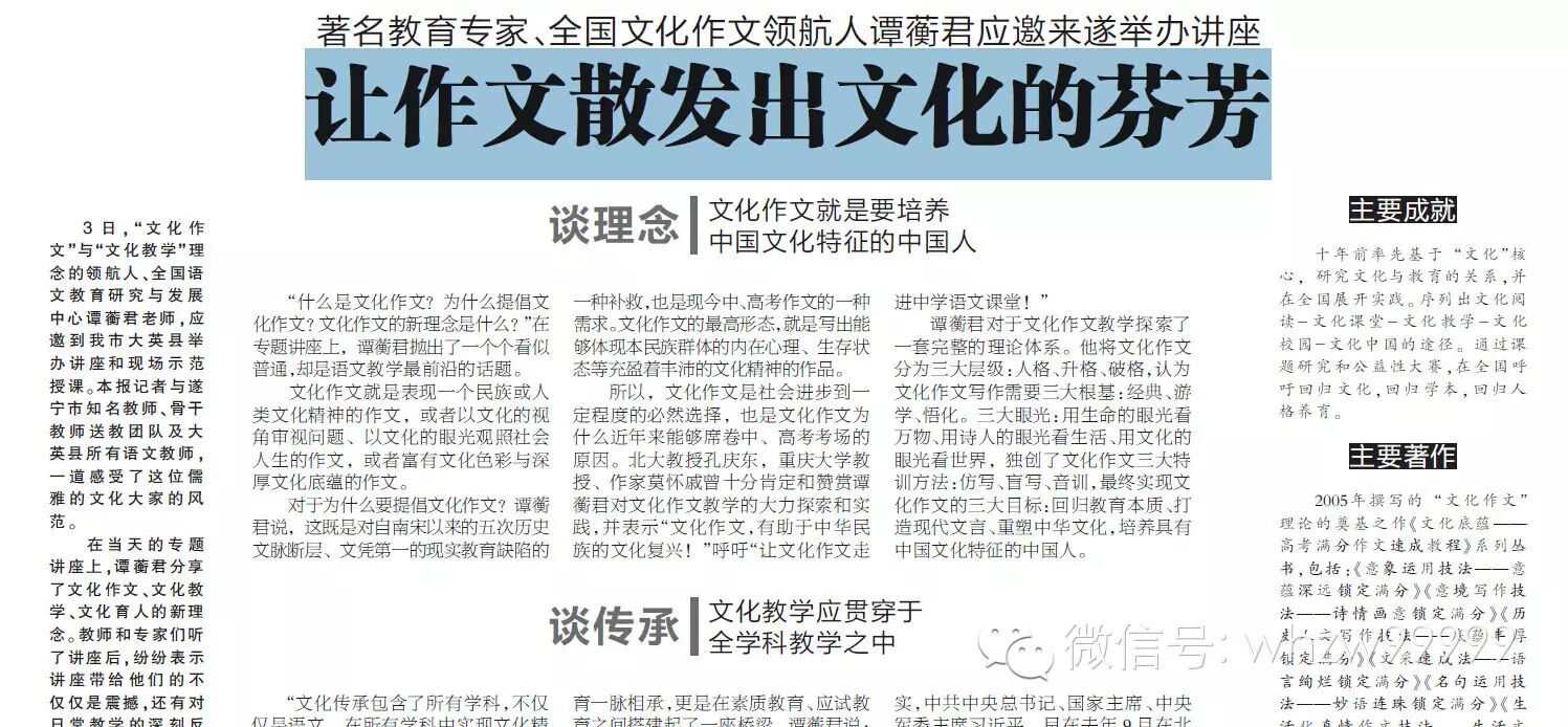 注:以下是《遂宁晚报》6月5日第三版对谭蘅老师遂宁讲座上课的报道及文化作文与文化教学相关理念介绍。网址:http://snrb.snxw.com/pdf/sczm/pdf/2015/1503/1503.2015.06.05.03.pdf 著名教育专家、全国文化作文领航人谭蘅君来遂传经送宝让作文散发出文化的芬香